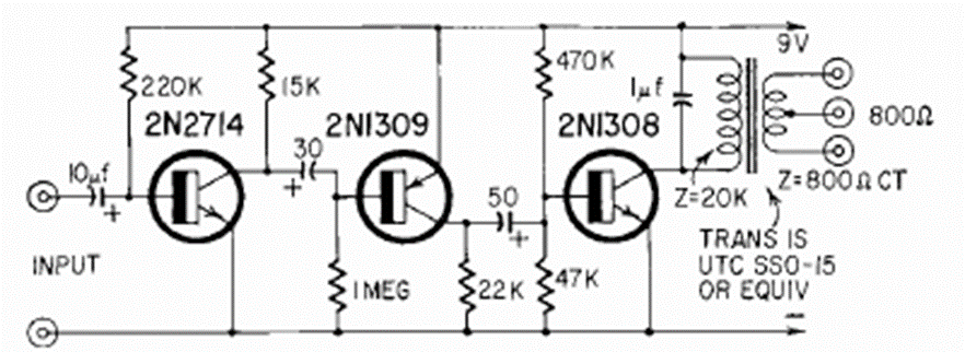 This “brainwave” amplifier was published in Radio Electronics magazine in August 1964. The transistors are contemporary, and the circuit amplifies low-frequency signals into a recorder. The power supply is 9 V.