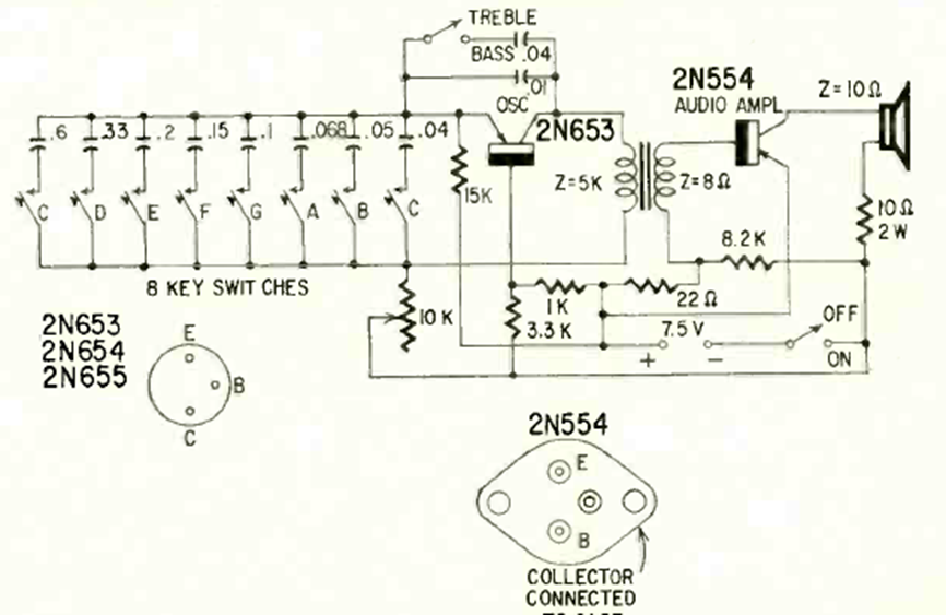 We found this simple toy organ circuit in the February 1968 issue of Radio Electronics magazine. The transistors were common at the time and the transformer was from a transistor radio output.