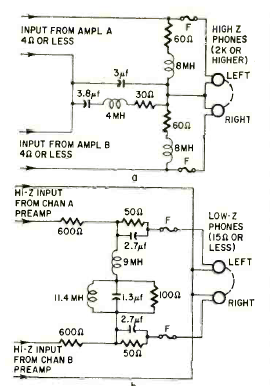 In the figure we have adapter circuits for using stereo headphones in an amplifier without a headphone output. The two circuits were obtained from the October 1962 Radio Electronics magazine.