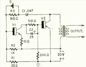 This oscillator with common general-purpose transistors appeared in Radio Electronics magazine in February 1959. The frequency depends on the capacitors and the power comes from a battery.