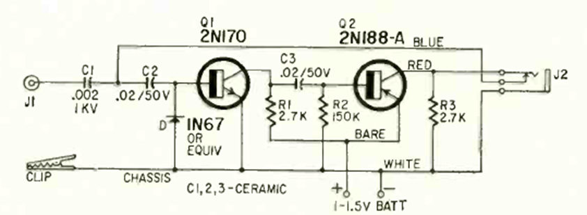 This two-transistor circuit is from a December 1964 Radio Electronics. Modern transistors can be tested. The headphone must be high impedance or crystal with a 2k2 resistor in parallel.
