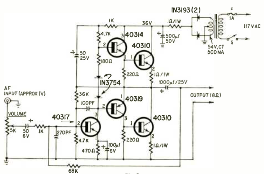 This transistor amplifier was published in Radio Electronics magazine in July 1965. It used newly released silicon transistors with excellent sound quality.