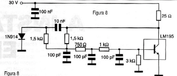 The circuit exemplified in figure 8 is suggested by National Semiconductor and is based on an enhanced power transistor, which is the LM195. This transistor can provide a maximum output current of 1 A and consists of a Darlington with additional elements. The base excitation current is only 3 µA and it has a switching time of 500 ns with a saturation voltage of 2 V. The base can be excited by voltages of 40 V without problems. In this application we have an RC power oscillator that operates at a frequency of 1MHz. The LM195 housing is TO-3, and a TO-220 equivalent is the LM395T.