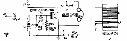This simple 1 transistor circuit was found in an American documentation from the 60's. The earphone is magnetic and the germanium transistor of the time.