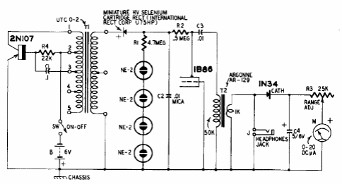 This circuit includes a high voltage inverter to power a Geiger tube. We found it in an American documentation from the 60s.