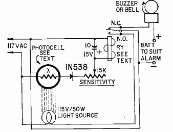 This simple passage alarm is powered by the power grid using an LDR as a sensor. The circuit is from a February 1962 Radio Electronics magazine.