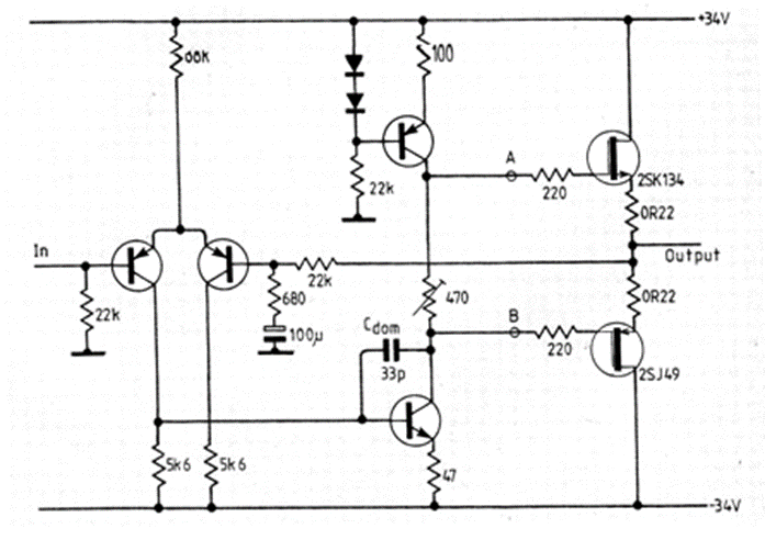 This circuit was obtained from a 1990 English magazine. The circuit can be assembled with MOSFETs of equivalent power. The transistors of the PNP input differential pair can be BC557 and the NPN pair can be BC547. To excite the MOSFETs, the BD136 (PNP) can be used. The source must be dual, and the power is a few tens of watts. The source current must be at least 2 A.