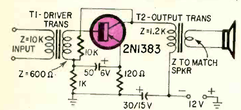 This circuit is from a Radio Electronics from October 1963. The transistor is a power transistor of the time, and two transformers are used. The input has 10k impedance and is powered by 12 V.