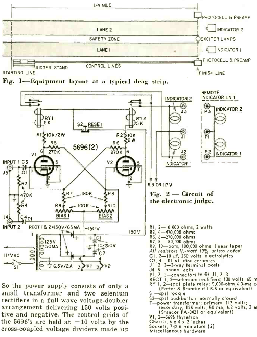 This circuit uses sensors to determine who is the first to cross the end line. The circuit was found in a Radio Electronics from 1961 January in a article teaching how to build it.