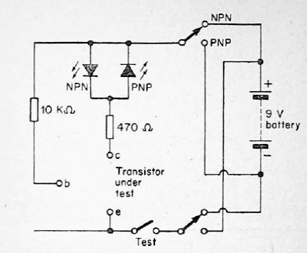 This simple transistor tester was found in old English documentation. Suitable for general purpose transistors.