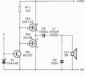 Found in a 1995 documentation, this circuit is an alternative output to the previous circuits. The MOSFETs admit equivalents and must be equipped with heat sinks.