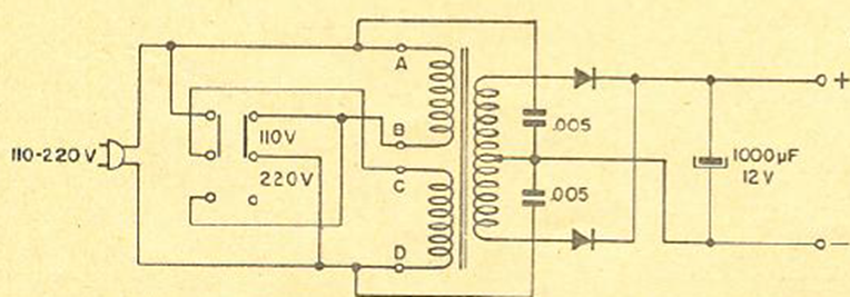 Without regulation, this basic circuit has the output current, and voltage determined by the transformer. The input can be 110 V and 220 V if the transformer used is of the indicated type.