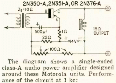This circuit with a 1950s RCA power transistor was found in the May 1959 Radio Electronics magazine. The circuit has a collector current of 700 mA and provides 4 W of power.