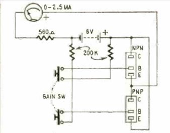 This circuit is from a commercial transistor test model found in the March 1958 Radio Electronics magazine. The circuit uses an analog indicator.