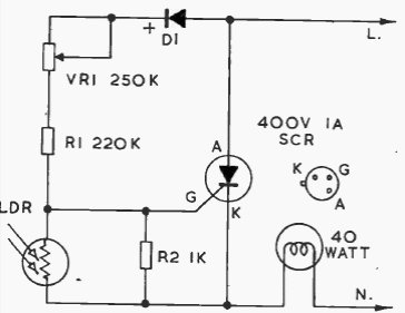 This circuit activates an incandescent lamp when the light stops falling on the sensor. The circuit can use 106 series SCRs controlling lamps up to 300 W.