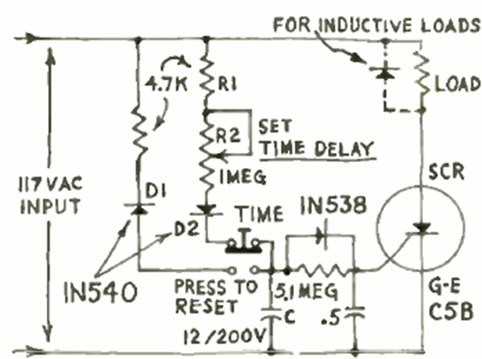 This circuit was found in a Radio Electronics magazine from May 1967. The circuit has the time determined by the capacitors and the adjustment of the 1 M potentiometer.