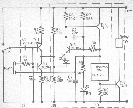 This mechanical option touch switch was found in an old English documentation. Transistors may be modern equivalents. The activation is done with a relay.