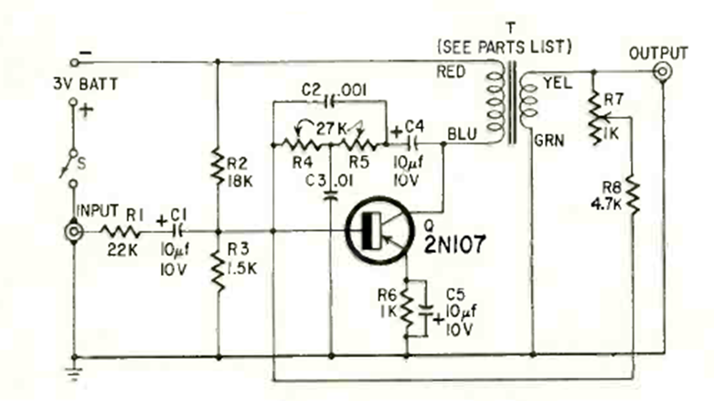 The idea of this circuit found in a Radio Electronics from January 1966. The idea of the circuit is to improve the reception of audio signals, mainly telegraphy, working as a filter.