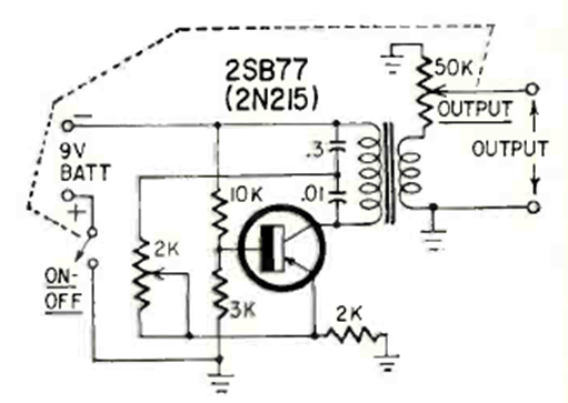 This Hartley oscillator can be used in tests or as a signal injector. The transformer is the type found in transistor radios of the time. The circuit is from a Radio Electronics from April 1965.