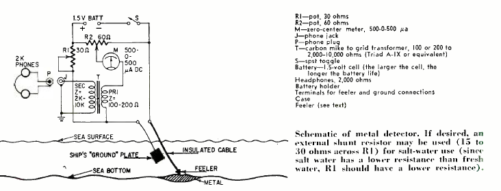 The idea of this interesting detector is to detect the changes in conductivity that occur with the presence of a metal object buried at the bottom of a river or the sea. The circuit is from a Radio Electronics from July 1960.