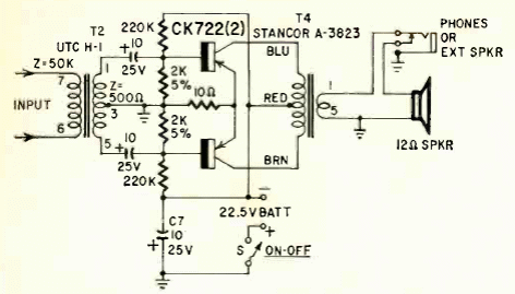 This fraction of a watt power stage was published in Radio Electronics September 1950. Transformers were special types of the day. There was a headphone jack.