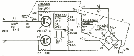 The purpose of this amplifier that we found in the Radio Electronics magazine of October 1952 is to increase to 200 kohm/V the input resistance of an instrument in measuring voltage.