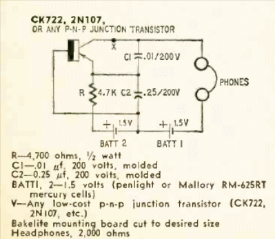 This circuit takes advantage of the inductance of the coil of a high-impedance phone to form the LC circuit that determines the frequency. The circuit is from a Radio Electronics from June 1959.