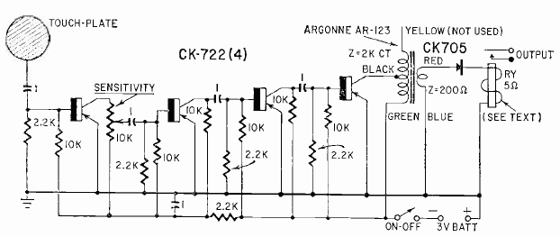We found this circuit in Radio Electronics magazine from June 1960. The four-transistor circuit is sensitive and powered by batteries. The relay is in accordance with the battery.