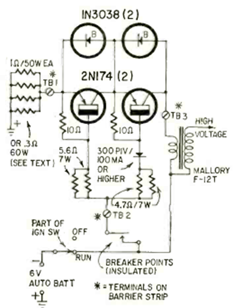 This circuit is for cars with old contact breaker and a 6 V battery. The circuit is from a Radio Electronics from January 1965. The power transistors and zener diodes are types from the time.