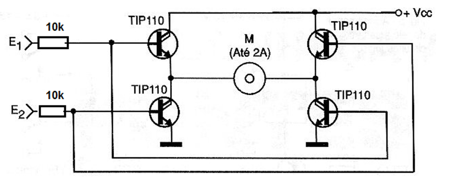 A bridge with greater sensitivity and, therefore, lower consumption for the microcontroller outputs is shown below, making use of Darlington transistors. This bridge has 4 possible states, 00 for the motor stopped, 01 and 10 for both directions of rotation and the prohibited state 11 which leads all transistors to conduction and thus a short circuit situation. Transistors must be equipped with heat sinks. The separate power supply for the motors can be between 3 and 15 V.