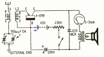 This receiver was found in the Radio Electronics magazine of March 1953. It tunes to the medium wave band and with the polarization adjustment it manages to excite a small loudspeaker.
