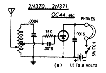 This old radio with a germanium transistor was obtained from an English documentation from the 70's. The transistor can be any type and the headphones must be 2k or more impedance.