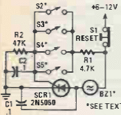 This latching alarm using SCR was found in a Popular Electronics from 1992. The circuit triggers a buzzer. Be aware of the voltage drop across the SCR while driving.