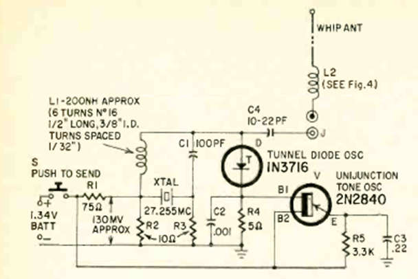 This circuit outputs a signal modulated by a unijunction oscillator. The circuit is from a Radio Electronics magazine from June 1963, using components from the time.