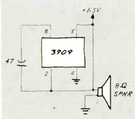 This is the basic version of a small audio oscillator with the LM3909. The circuit must be powered with 1.5V and the capacitor determines the frequency of the signal.