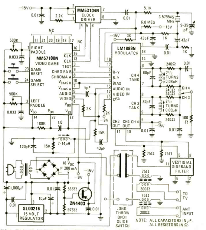 This complete video game circuit was found in the May 1978 issue of Radio Electronics magazine. The circuit includes the power supply and timing based on the MM5710N.