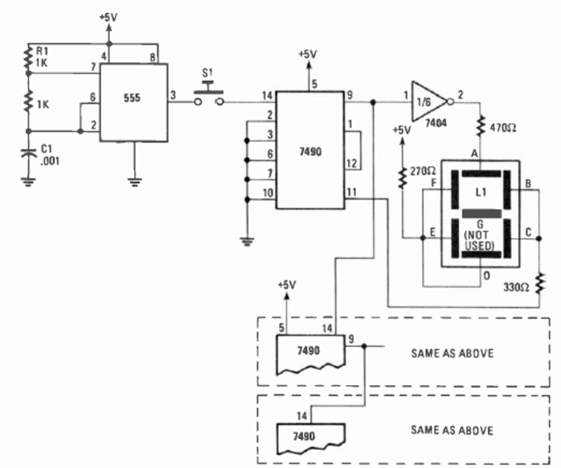 This digital circuit was found in the September 1980 issue of Radio Electronics magazine. The circuit uses TTL logic and must be powered with 5 V. The sliding effect of the segments can be changed by changing C1.