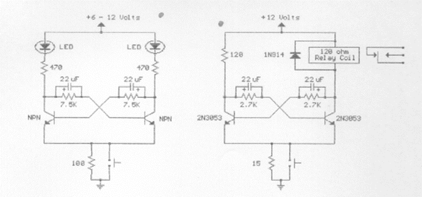 This circuit was found in documentation from the 90s. The transistors can be general-purpose equivalents. The circuit has two versions, one that drives LEDs and another that drives a relay as a load.