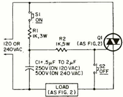 This conventional bistable power control circuit using triac was found in the June 1970 Radio Electronics magazine. The triac is load-dependent. The circuit can be modified to operate on 220 V.