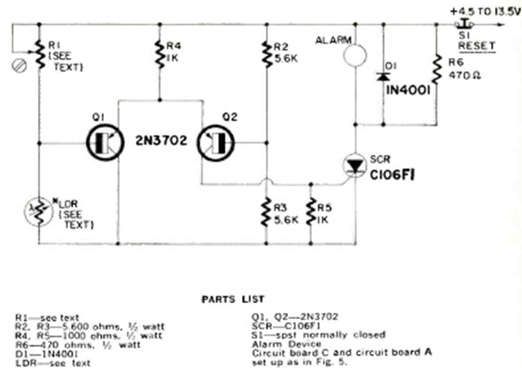 This circuit was found in the September 1971 Radio Electronics magazine. The buzzer can be replaced by a relay according to the supply voltage. R1 adjusts the sensitivity.
