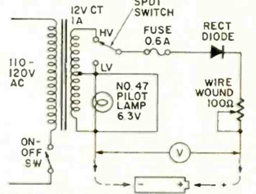 This simple battery charging circuit was found in the December 1970 issue of Radio Electronics magazine. The current is dependent on the setting of the wire potentiometer, and the circuit charges individual cells to near the secondary voltage of the transformer.