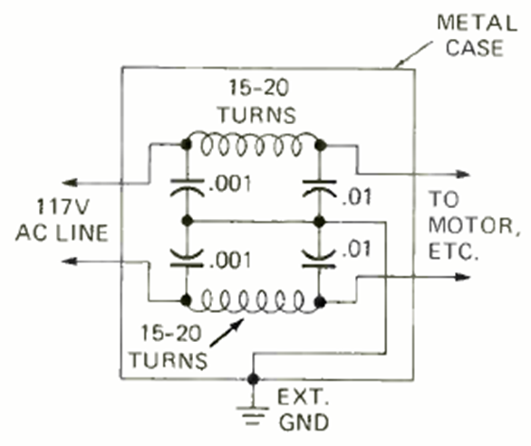 This filter for interference generated by motors via the power grid was found in the June 1972 issue of Radio Electronics magazine. The inductors should be wound with wire of a thickness according to the motor current and the capacitors ceramic or polyester.
