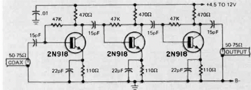This untuned (aperiodic) amplifier circuit was found in the August 1974 Radio Electronics magazine. The transistors are period, and the board layout is critical.