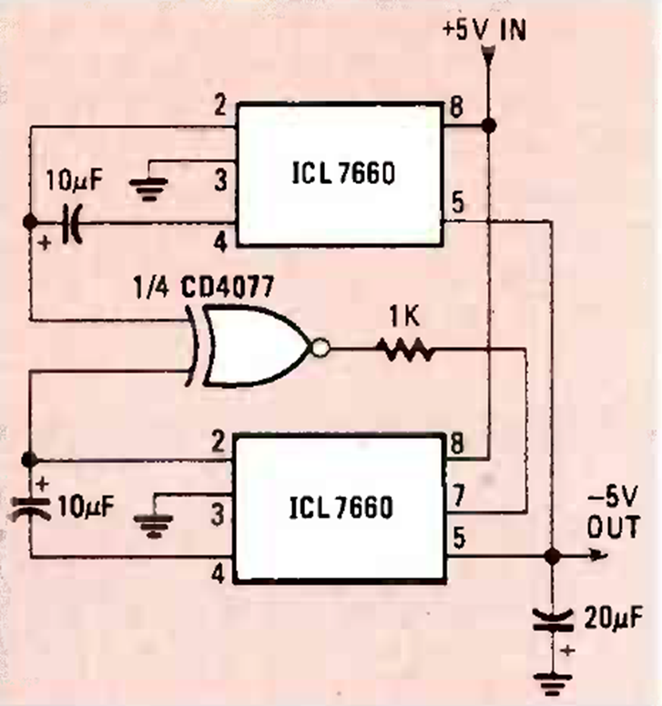 With this circuit it is possible to obtain a voltage of -5 V from a 5 V source. The circuit is from Radio Electronics from May 1982. The maximum current is around 80 mA.