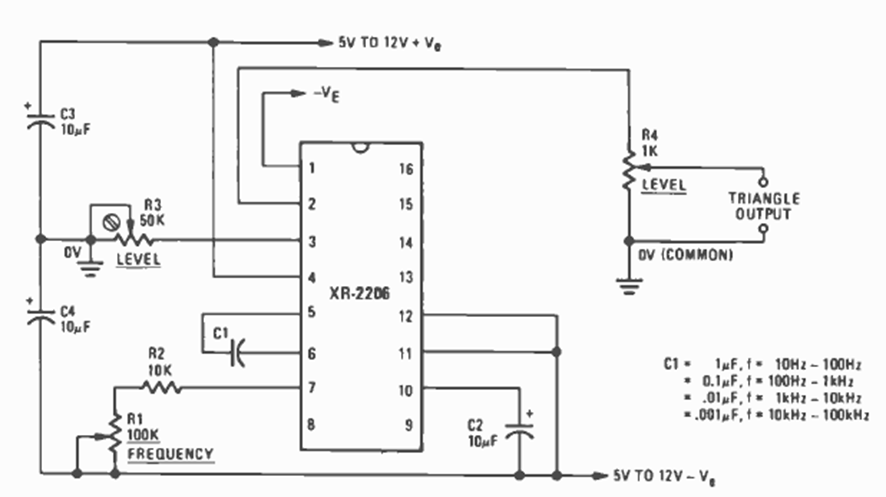 Found in an April 1977 Radio Electronics issue, this circuit uses the well-known XR2206. The C1 values for the various frequency bands are given next to the diagram.