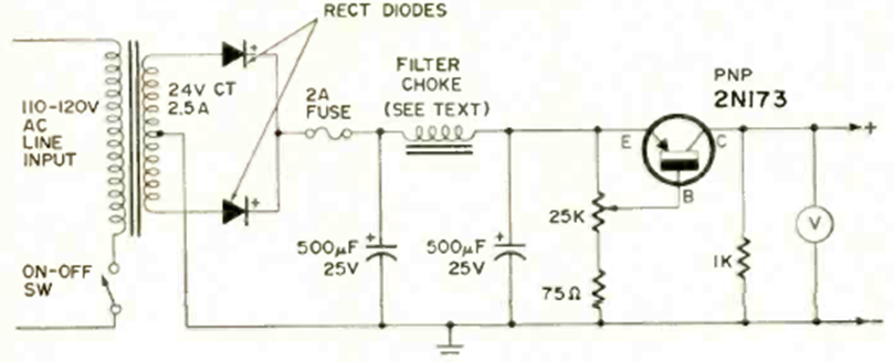 This power supply was found in the December 1970 issue of Radio Electronics magazine. The transistor may be a TIP42 mounted on a heat sink. The output voltage is adjusted using a 25 kΩ potentiometer.