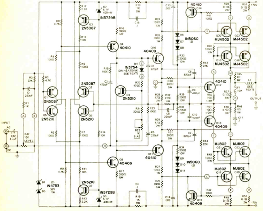 This powerful high-fidelity amplifier was described in an article in Radio Electronics magazine in December 1973. Note the use of 8 high-power transistors that must be mounted on excellent heat sinks.