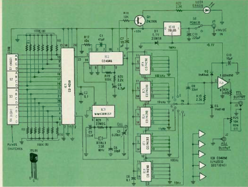 This synthesized generator circuit was found in an article in October 1980 Radio Electronics magazine. The article taught how to assemble it. The circuit generates signals from 1/100 Hz to 1 MHz.