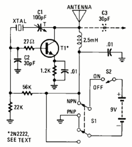 This circuit, which can function as a small transmitter, was found in the July 1978 issue of Radio Electronics magazine. The frequency depends on the crystal and can reach a few tens of megahertz.