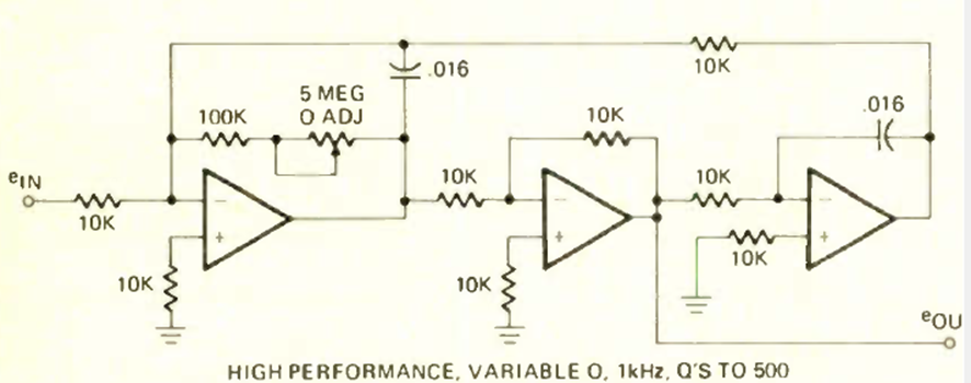 This variable filter circuit was found in July 1975 Radio Electronics magazine. The circuit uses 3 general purpose op-amps like the 741 and must use a symmetrical source.
